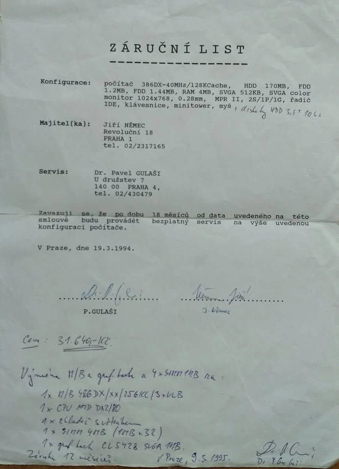 Záruční list k 386dx 40 Mhz z 19.3. 1994 aktualizovaný 9.3.1995